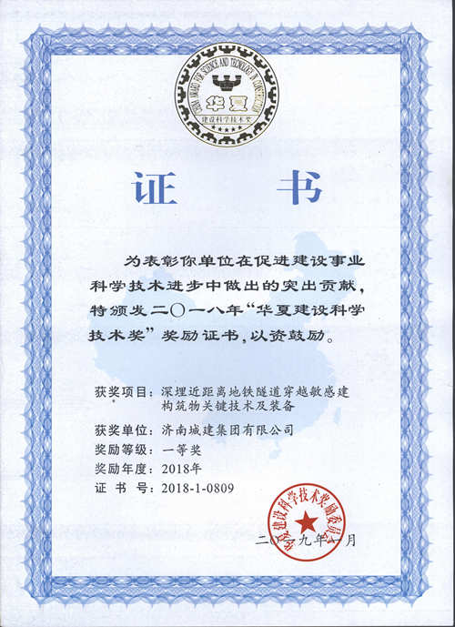 集團(tuán)《深埋近距離地鐵隧道穿越敏感建構(gòu)物關(guān)鍵技術(shù)及裝備》榮獲華夏建設(shè)科學(xué)技術(shù)獎(jiǎng)一等獎(jiǎng)
