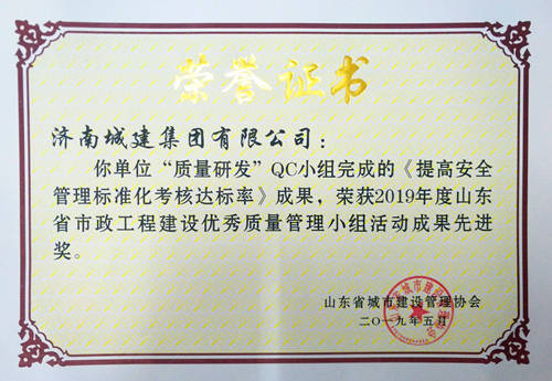 集團“質量研發(fā)”QC小組完成的《提高安全管理標準化考核達標率》成果榮獲“2019年度山東省市政工程建設優(yōu)秀質量管理小組活動成果先進獎
