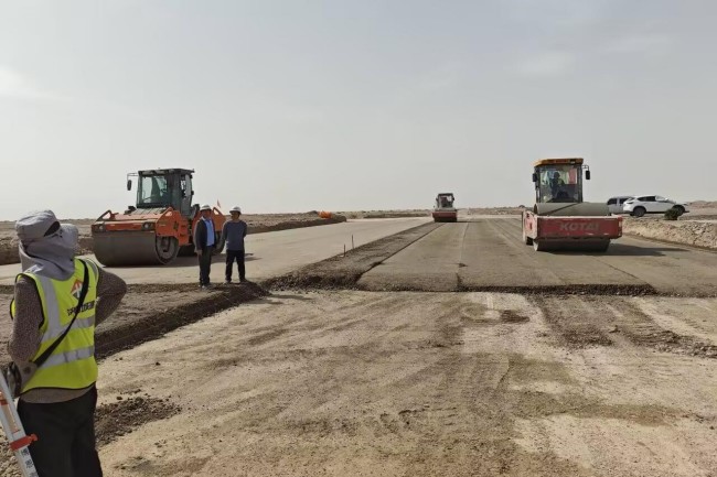 項(xiàng)目團(tuán)隊(duì)在施工過程中克服了地域差異和風(fēng)沙大等惡劣自然環(huán)境,科學(xué)統(tǒng)籌、加強(qiáng)調(diào)度,與各個(gè)施工班組緊密聯(lián)動(dòng),高效完成各項(xiàng)施工任務(wù)。通過“人力動(dòng)態(tài)調(diào)配+物資智能儲(chǔ)備”優(yōu)化資源配置,高強(qiáng)度高質(zhì)量高效能施工,施工高峰期時(shí)300輛水穩(wěn)運(yùn)輸車同時(shí)作業(yè)。嚴(yán)格落實(shí)集團(tuán)標(biāo)準(zhǔn)化管理,提前完成路床換填,盡顯項(xiàng)目團(tuán)隊(duì)專業(yè)攻堅(jiān)能力。項(xiàng)目施工遇沙塵暴天氣,項(xiàng)目部全體建設(shè)者主動(dòng)加壓提速,每周進(jìn)度碰頭會(huì)實(shí)時(shí)監(jiān)控進(jìn)展,發(fā)現(xiàn)偏差及時(shí)糾偏,確保各項(xiàng)關(guān)鍵節(jié)點(diǎn)高質(zhì)高效完成。