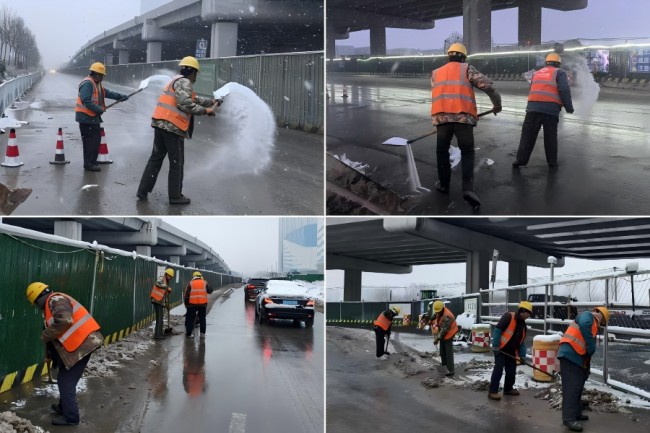 城建二公司軌道交通7號(hào)線項(xiàng)目山大路站及歷山北路站項(xiàng)目部第一時(shí)間響應(yīng),組織項(xiàng)目部職工組建應(yīng)急清雪隊(duì)伍,迅速開(kāi)展輔路及人行道積雪清掃、融雪劑鋪撒專(zhuān)項(xiàng)行動(dòng)。針對(duì)背陰路段易結(jié)冰的特點(diǎn),作業(yè)人員科學(xué)把控融雪劑撒布量,做到無(wú)死角、全覆蓋,最大限度降低路面結(jié)冰風(fēng)險(xiǎn)。